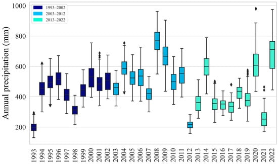 Variation in annual precipitation over three decades in the DNC, Pernambuco. Each box represents the data dispersion, where the central line indicates the median. The boxes cover the interquartile range (IQR) of the data, while the lines outside the boxes show the extreme values.