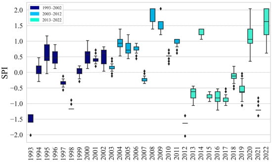 Variation in SPI over three decades in the DNC, Pernambuco. Each box represents the dispersion of the data, where the central line indicates the median. The boxes cover the interquartile range (IQR) of the data, while the lines outside the boxes show the extreme values.