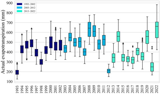 Variation in annual actual evapotranspiration over three decades in the DNC, Pernambuco. Each box represents the data dispersion, where the central line indicates the median. The boxes cover the interquartile range (IQR) of the data, while the lines outside the boxes show the extreme values.