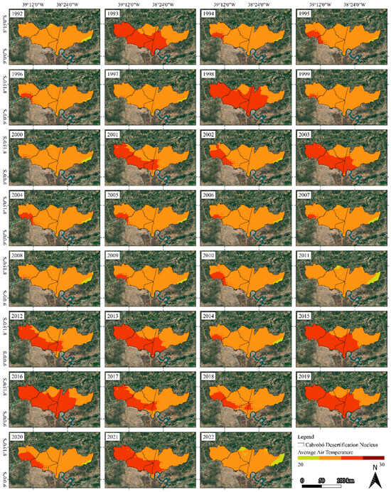 Space–time variation in mean temperature (°C), from 1992 to 2022, in the DNC, Pernambuco, Brazil.