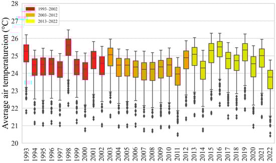 Variation in annual air temperature (°C) over three decades in the DNC, Pernambuco. Each box represents the dispersion of data, where the central line indicates the median. The boxes cover the interquartile range (IQR) of the data, while the lines outside the boxes show the extreme values.