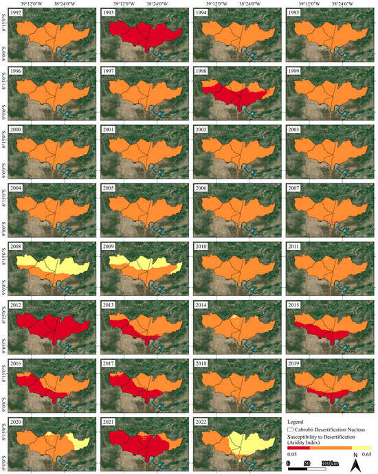 The results of AI are depicted in Figure 16, which exposes not only aridity but also the susceptibility of a particular region to desertification. The spatial patterns of AI in the years 1993, 1998, 2012, 2013, 2015, 2016, 2017, 2019, and 2021 indicate a prevalence of arid conditions and very high susceptibility to desertification. In 1993 and 2012, the DNC demonstrated this climatic condition across 100% of its territory. The influence of El Niño and La Niña was present in some years of this study. El Niño occurred in 1992, 1997, 1998, 2015, 2016, 2018, and 2016, influencing the reduction in rainfall and, consequently, the increase in AI and susceptibility to desertification [67,68]. In the other years, when the arid classification did not cover the entire area, the southern and western regions of the nucleus were always under such extreme conditions.