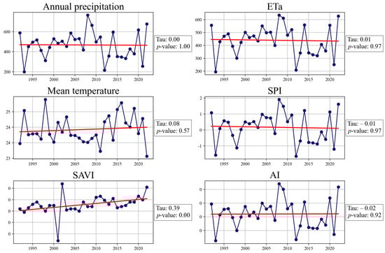 We computed the annual average of the climatic variables, SAVI, and LULC classes. This average is calculated considering the data from all pixels of the raster images. We had 31 raster images, one for each year, and each resulted in an annual average. The Mann–Kendall statistical analysis was performed using these annual averages.