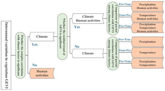 The RESTREND method is commonly employed to disentangle the influence of human activities from the interannual variability of vegetation productivity, thereby facilitating the detection of drivers of vegetation change. In this study, the RESTREND method was applied to discern the drivers of the interannual vegetation GEVI change on the QTP, accounting for time-lagged effects of temperature and precipitation. The specific description of the driver identification framework is provided below, with its general flow illustrated in Figure 2.