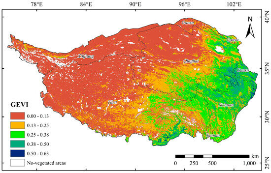Spatial pattern of multi-year average GEVI on the QTP from 2000 to 2020.