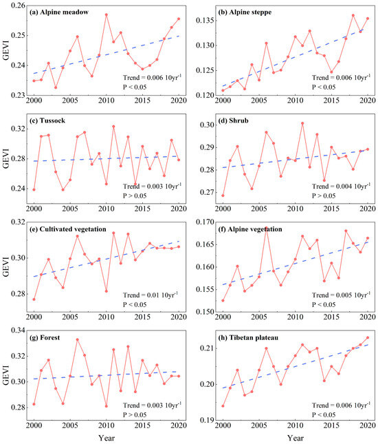 Interannual variations of GEVI for different vegetation types (The red line represents the interannual variation in GEVI, while the blue dashed line represents the linear trend of this variation).