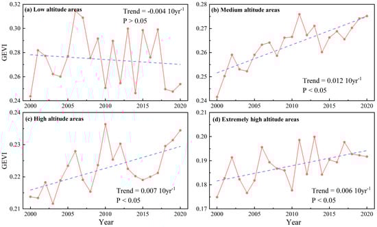 Interannual variations of GEVI within different altitude areas (The red line represents the interannual variation in GEVI, while the blue dashed line represents the linear trend of this variation).