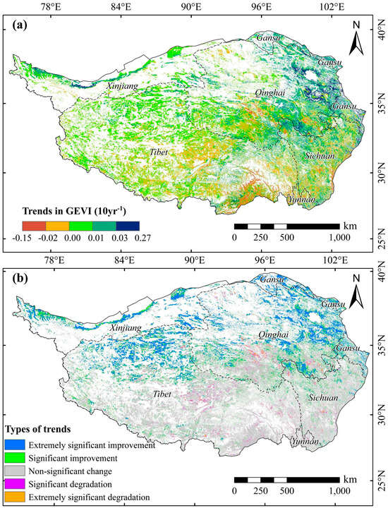 Spatial distributions of trends (a) and trend types (b) of vegetation GEVI on the QTP, from 2000 to 2020 (unshaded areas refer to non-vegetated areas).