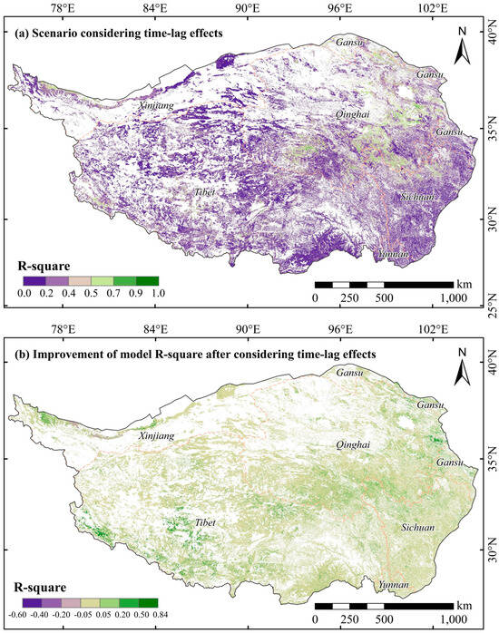 When not accounting for lag effects, the explanatory power (R2) of climate on interannual variations in the GEVI ranged from 0 to 0.91, with a mean value of merely 0.19. Areas with R2 exceeding 0.5 constituted only approximately 5.8% of the total vegetation area. However, upon considering lag effects, the explanatory power of climate significantly improved, with the mean R2 value increasing to 0.25. Moreover, areas with R2 greater than 0.5 accounted for approximately 9.7% of the total vegetation area, marking a 3.9% increase compared to scenarios where lag effects were not considered (Figure 8a). The enhancement in R2 of the linear model after considering the lag effects was calculated pixel by pixel, with its spatial distribution depicted in Figure 8b. Notably, after considering lag effects, instances of the decreasing explanatory power of climate were minimal. Conversely, approximately 29% of the total vegetation area exhibited phenomena of increasing explanatory power, primarily situated in the southern and eastern regions of Qinghai Province, as well as in the central and eastern parts of Tibet (Figure 8b). However, for pixels encompassing roughly 69% of the total vegetation area on the QTP, there was no significant change in model R2 after considering lag effects. This observation could be attributed to intense human activities disrupting the correlation between climate and vegetation productivity, thereby overshadowing the climate’s control of vegetation productivity.