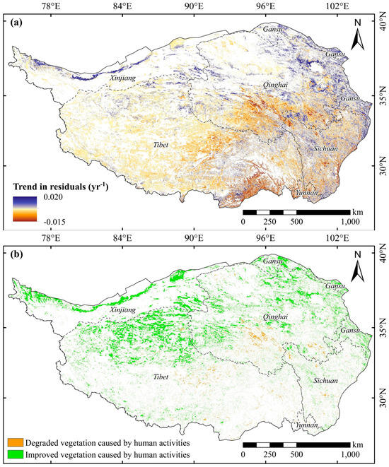 Based on the driver identification framework in Section 3.2, this study calculated the residual series of the GEVI on a pixel-by-pixel basis by constructing a linear response model of the vegetation GEVI to climate factors, considering time-lag effects. Spatial statistics of the residual trends (Figure 9a) unveiled several key findings: Approximately 26% of the total vegetation area exhibited significant residual trends, indicating that interannual variation in vegetation within these regions were not solely driven by climate but also influenced by human activities (Figure 9b). Specifically, areas where human activities positively impacted vegetation growth constituted about 23% of the total vegetation area, primarily concentrated in the northern and central-western regions of the QTP (Figure 9b). Conversely, regions where human activities negatively affected vegetation growth accounted for a relatively small proportion, approximately 3%, primarily distributed in parts of the Sanjiangyuan region and central part of Tibet (Figure 9b). These areas are located in typical pastoral regions of the QTP, where high-intensity grazing and infestations of rodent and insect pests may lead to vegetation degradation [37,38]. However, it is noteworthy that the areas where vegetation growth has been positively influenced by human activities over the past two decades are significantly larger than those where it has been inhibited. This phenomenon can be attributed to extensive ecological restoration and environmental protection initiatives implemented by the Chinese Government across the QTP over an extended period [39]. These efforts have effectively restored and enhanced the local vegetation ecosystem.