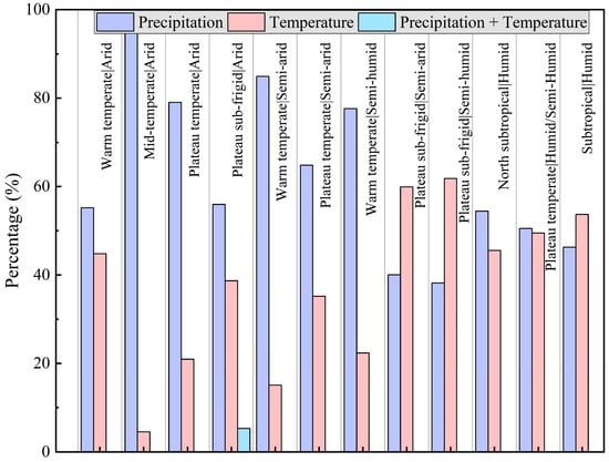 In this study, the QTP was divided into 12 climate zones by superimposing temperature and wet/dry zones. By examining the types of climate driver within each climate zone, several significant observations were made: Across warm temperate semi-arid, mid-temperate arid, plateau temperate arid, plateau subfrigid arid, warm temperate semi-arid, plateau temperate semi-arid, and warm temperate semi-humid zones, the percentage of pixels where precipitation was identified as the dominant factor exceeded that of temperature by at least 10% (Figure 11). This supports the general conclusion that vegetation in arid regions, limited by water, is particularly sensitive to precipitation. In the plateau subfrigid semi-arid and plateau subfrigid semi-humid regions, the percentage of pixels with temperature as the dominant factor exceeded those with precipitation as the dominant factor (Figure 11). This discrepancy arises from the predominant limitation of vegetation in these regions by temperature, leading to a greater sensitivity of the vegetation’s interannual variation due to temperature. Within north subtropical humid, plateau temperate humid/semi-humid, and subtropical humid regions, where hydrothermal conditions are balanced, vegetation growth is not subjected to specific climatic stresses. Consequently, the areas dominated by precipitation are similar in proportion to those dominated by temperature (Figure 11). In low-temperature regions, rising temperatures initially alleviate temperature stress on vegetation. However, continued temperature increases exacerbate drought by enhancing evapotranspiration, negatively impacting vegetation growth. Consequently, the roles of temperature and precipitation become interchangeable, with precipitation emerging as the primary driver of vegetation change as temperatures rise. In arid regions, as more precipitation occurs, the dominant factor in vegetation change shifts from precipitation to temperature. Overall, the main climatic factors driving vegetation change within the same region vary with climate conditions. This variability explains the presence of temperature-dominated and precipitation-dominated areas within arid and cold regions, respectively.