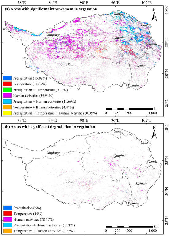 (1) In the QTP, the drivers that dominated the significant improvement of vegetation were identified as precipitation, temperature, precipitation combined with temperature, human activities, precipitation combined with human activities, temperature combined with human activities, and precipitation combined with temperature and human activities. These drivers accounted for approximately 15.82%, 11.05%, 0.02%, 56.01%, 11.69%, 4.47%, and 0.05% of the total area where vegetation improved, respectively (Figure 12a). Human activity-driven vegetation improvement accounted for the largest proportion (approximately 56%), mainly distributed in the northwestern and central-northern parts of the QTP (Figure 12a). Precipitation dominated vegetation improvement in approximately 16% of the area, primarily in the northeastern part of the QTP (Figure 12a). Temperature-driven vegetation improvement accounted for about 11% of the area, primarily in the Sanjiangyuan region (Figure 12a). Vegetation improvement dominated by both precipitation and human activities was observed in approximately 12% of the area, mainly distributed around regions where precipitation dominates (Figure 12a). Similarly, areas where temperature and human activities jointly drive vegetation improvement constituted about 4% of the total area, primarily clustered around temperature-dominated areas (Figure 12a).