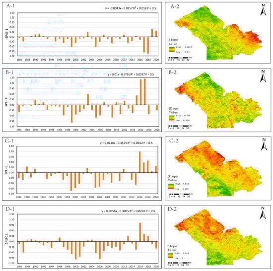 Changes and spatial trends of SPEI at different time scales in the Shendong Mining Area from 1986 to 2020. (A-1,B-1,C-1,D-1) are respectively the bar graphs of the annual mean values of SPEI on 1, 3, 6 and 12 month scales. (A-2,B-2,C-2,D-2) are respectively the spatial distribution maps of the increase and decrease trend of SPEI from 1986 to 2020 on the scale of 1, 3, 6 and 12 months.