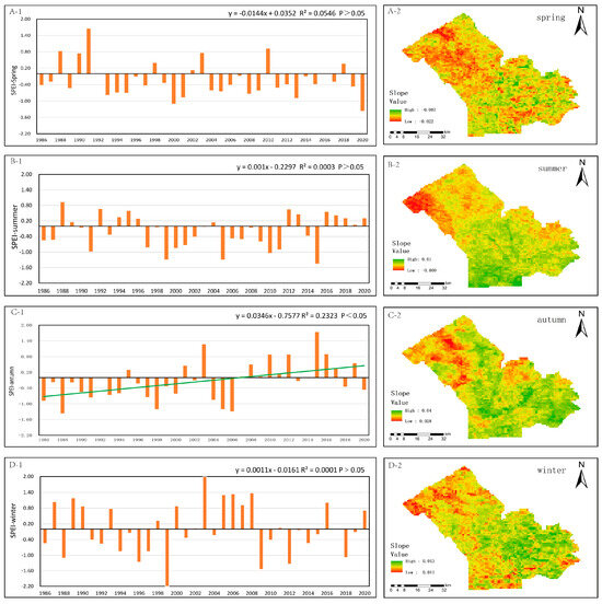 Changes and spatial trends of SPEI in different seasons of Shendong Mining Area from 1986 to 2020. (A-1,B-1,C-1,D-1) are the average bar charts of SPEI in spring, summer, autumn and winter respectively, and (C-1) also has A straight line because its significance p < 0.5. (A-2,B-2,C-2,D-2) are the spatial distribution maps of SPEI increase and decrease in spring, summer, autumn and winter from 1986 to 2020, respectively.