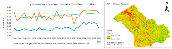 The temporal and spatial variations in NDVI annual average values and time series variations in maximum values from 1986 to 2020.
