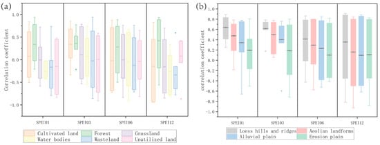 (a) Correlation coefficients between SPEI at different time scales and NDVI of different landform types. (b) Correlation coefficients between SPEI at different time scales and NDVI of different land use types.