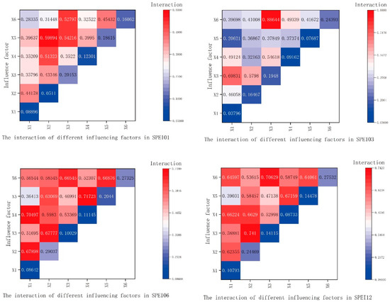 As can be seen from Figure 9, the NDVI exhibits a robust ability to explain SPEI values over different time scales, namely 1 month, 3 months, 6 months, and 12 months. Notably, the 12-month scale demonstrates statistical significance at a level of 0.1. The interaction between relative humidity and NDVI has a considerable impact on SPEI values across all time scales, taking into account the interactive impacts of numerous components. However, on the 1-month scale, the impact factors of these interactive effects do not reach 0.6. The synergistic impacts of temperature and precipitation, temperature and relative wind speed, precipitation and relative humidity, sunshine duration and NDVI, and other combinations exert a substantial influence on SPEI values at the 6- and 12-month timeframes. The 3-month scale of SPEI values is greatly influenced by relative humidity and temperature. On the other hand, the 12-month scale is significantly affected by the interaction between temperature and NDVI, as well as precipitation and wind speed. The majority of interactive effects exhibit non-linear enhancement. The interaction between NDVI and precipitation demonstrates dual-factor enhancement at the scales of 3, 6, and 12 months. Similarly, the interaction between NDVI and temperature, as well as relative wind speed, exhibits dual-factor enhancement at the 1-month scale. Likewise, the interaction between relative humidity and relative wind speed demonstrates dual-factor enhancement at the 1-month scale.