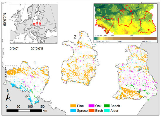 Location of the regional directorates of state forests used in this study (1—Wroclaw, 2—Lodz, 3—Lublin) and spatial distribution of the tree species masks in MODIS grid (orange—pine, blue—spruce, purple—oak, green—beech). In the upper right-hand corner the directorates’ borders are presented over the elevation map (source of the elevation map: pl.wikipedia.org, accessed on 21 October 2022). The black dashed line indicates the pine-forested area showcased in detail in this study.
