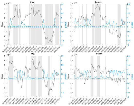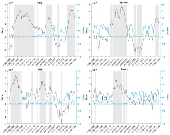 The slopes (z-score for NDVI·month−1) of the linear trends of monthly NDVI z-scores over four species (pine, spruce, oak and beech) (black lines) and their p-values (blue lines) from 2002 to 2022 in moving 5-year (60-month) periods. The statistical significance level of α = 0.05 is indicated by blue dashed lines. Statistically significant slopes are additionally highlighted with a grey colour.