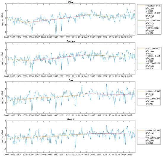 The course of NDVI z-scores (blue line) for four tree species (pine, spruce, oak and beech) in the period 2002–2022. The graphs also present the running 37-month mean (orange line) and linear trends for the shorter periods (coloured are lines explained next to each graph), together with trend line equations, coefficients of determination R2 and p-values.