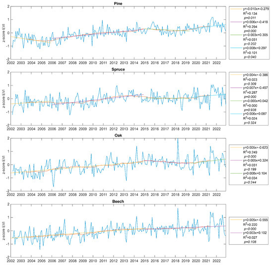 The course of EVI z-scores (blue line) for four tree species (pine, spruce, oak and beech) in the period 2002–2022. The graphs also present the running 37-month mean (orange line) and linear trends for the shorter periods (coloured lines are explained next to each graph), together with trend line equations, coefficients of determination R2 and p-values.