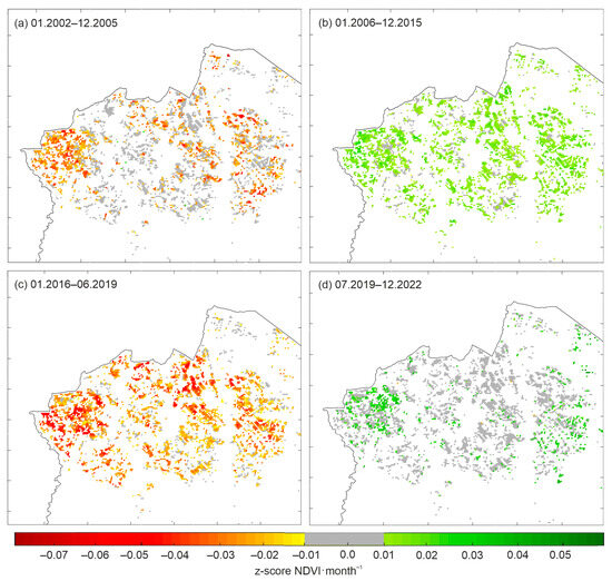 Slopes of the trends in NDVI z-scores (z-score for NDVI·month−1) in a selected pine-forested area in regional directorate of state forests in Wroclaw (location of this area is presented in Figure 1), in the periods 01.2002–12.2005 (a), 01.2006–12.2015 (b), 01.2016–06.2019 (c) and 07.2019–12.2022 (d). Grey colour indicates insignificant slopes at the significance level of α = 0.05.