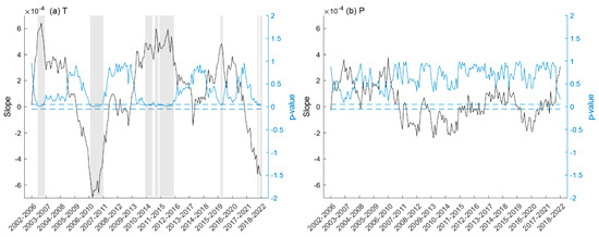 The slopes (z-score·month−1) of the linear trends of monthly z-scores for T (a) and P (b) and their p-values (blue lines) from 2002 to 2022 in moving 5-year (60-month) periods. The statistical significance level of α = 0.05 is indicated by blue dashed lines. Statistically significant slopes are additionally highlighted with a grey colour.