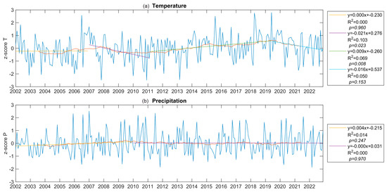 The course of z-scores (blue lines) for T (a) and P (b) in the period 2002–2022. The graphs also present the running 37-month mean (orange line) and linear trends for the shorter periods (coloured lines are explained next to each graph), together with trend line equations, coefficients of determination R2 and p-values.