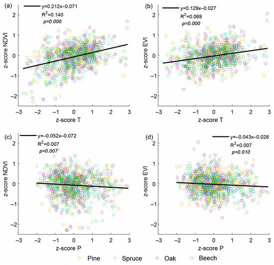 Relationship between z-scores for T (a,b) and P (c,d) and z-scores for NDVI (a,c) and EVI (b,d) over four species (pine, spruce, oak and beech) from 2002 to 2022. Each graph consist of 1008 points (252 points for each species), and also presents linear regression (black line), together with regression equation, coefficient of determination R2 and p-value.