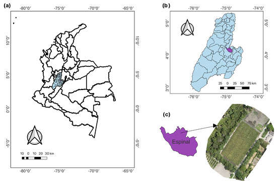 RiceClimaRemote dataset site’s location. (a) Colombia; (b) Tolima department; (c) Espinal and experimental field with RGB raster.