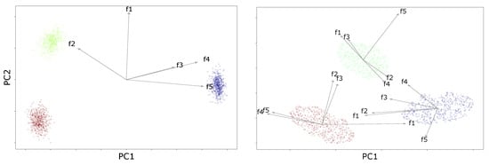 Multivariate Gaussians dataset visual inspection results. (Left): SVD-based biplot. (Right): Local Biplot (ours). Gray arrows depict each feature in the dataset (f1–f5), which shed light on their correlations. Examining the scatter points and their colors allows us to visually understand sample distributions. PC stands for principal component (basis).