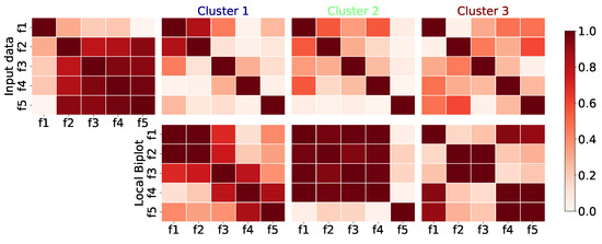 where holds the p-th column in , and A Local Biplot-based feature correlation is computed for a given matched basis matrix by replacing as the p-th row of in Equation (10). The feature relevance is also computed as in Equation (9). The latter aims to compare the input features linear relationships vs. our Local Biplot-based enhancement to code non-linear dependencies. The number of groups is fixed as three, four, and five for the Multivariate Guassians, Forage Grasses, and RiceClimaRemote datasets, respectively.
