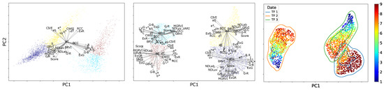 Forage Grasses biplots. Left: SVD-based biplot. Middle: Local Biplot. Right: Local Biplot and cluster-based probability boundaries. The colors in the left and middle plots represent the clustering label. The right plot’s color emphasizes the target variable (breeding score), while the flight dates (TF1, TF2, and TF3) determine the color of the curves. PC: principal component (basis).