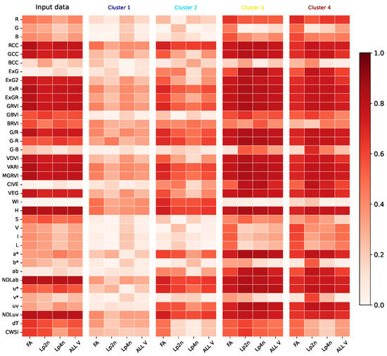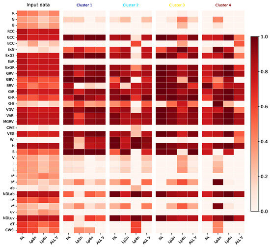 Further insights were obtained by calculating the absolute Pearson correlation between 37 indices and breeder score (see Figure 6). The high correlation value between the score and the visual-based indices in every cluster emphasizes the RGB color space’s crucial significance in revealing data variability. The consistent patterns of variation depicted by the aligned arrows hint at potential sources of multicollinearity. The lengths of arrows in the biplot analysis indicate that cluster 1 (dark blue) prioritizes variables like VARI, MGRVI, and ExR, while cluster 2 (cyan) focuses on G-R, u*, and uv. Clusters 3 (yellow) and 4 (brown), on the other hand, place higher importance on G/R, GRVI, MGRVI, VARI, and ExR (demonstrating similar values). Furthermore, CWSI holds less significance in cluster 1, and BRVI is less important in cluster 2. Similarly, WI shows lesser significance for clusters 3 and 4.