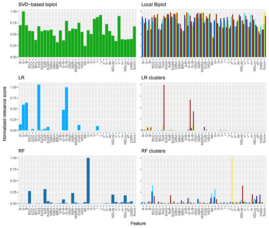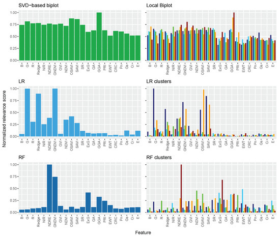 Finally, the relevance analysis (Figure 12) indicates that fewer variables are needed for accurate CWC predictions in LR and RF models compared to SVD. The selection of significant spectral bands varies across models, with RF identifying a broader range of important features, contributing to higher prediction accuracy. The variability in feature importance across clusters further demonstrates the heterogeneous nature of the data and the necessity of tailored analysis approaches for different subgroups. These changes can be attributed to the clustering of the UMAP projection within the Local Biplot, which effectively captures the local structure and non-linear relationships. Our framework isolates subsets of points that share similar characteristics.