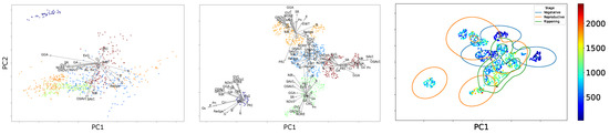 RiceClimaRemote biplot results. Left: SVD-based biplot. Middle: Local Biplot. Right: Local Biplot and cluster-based probability boundaries. The colors in the left and middle plots represent the clustering label. The right plot’s color emphasizes the target variable (CWC), while the growth stages of rice (vegetative, reproductive, and ripening) determine the color of the curves. PC: principal component (basis).
