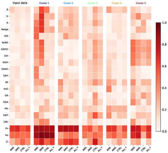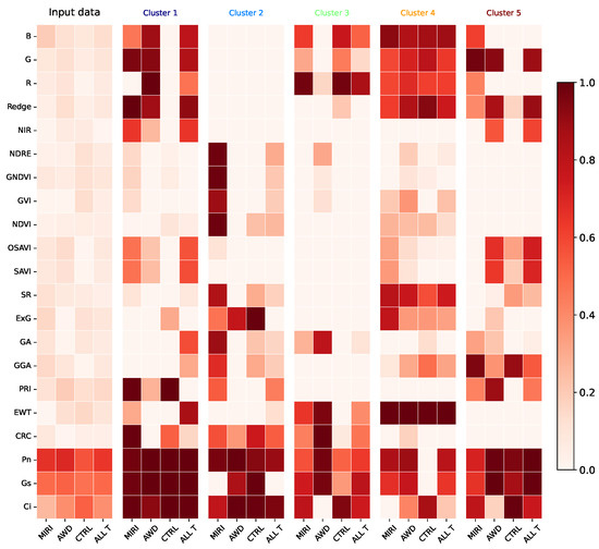 Figure 9 shows the visual inspection results on the RiceClimaRemote dataset. The basis (arrows) are over each projection. Shown also are 2D projections using CWC color. We present the absolute Pearson correlation between each of the 21 variables and the CWC (see Figure 10 and Figure 11). Each panel displays correlations for individuals, for all irrigation treatments (ALL T), and for the three irrigation treatments (MIRI, AWD, CONTROL) across all dates, taking into account both the original input features and clustered samples. Next, Table 4 presents the values for breeding score estimation. These models were trained using physiological parameters, Multiespectral, and RGB-based VIs for all data and for each cluster. Figure 12 displays the normalized input feature relevance analysis.