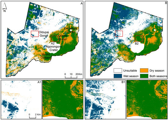 Under simplified human disturbances, the suitable area during solely the wet season increases by 1526.5 km2 (16.7%) covering 4903 km2 (53.6%) of the entire area (Figure 2B). During the dry season, the NCA remains almost unchanged, covering approximately 3344 km2 (35.5%) once the human disturbances are simplified (Figure 2B). The area that remains suitable through both seasons improved by 312 km2, covering 2224 km2. The Oldupai Gorge and surrounding area becomes more suitable once human disturbances are simplified during the wet season (Figure 2(B1)). The area between Olmoti Crater and the NC is suitable for the black rhino under both seasons (Figure 2(B2)).