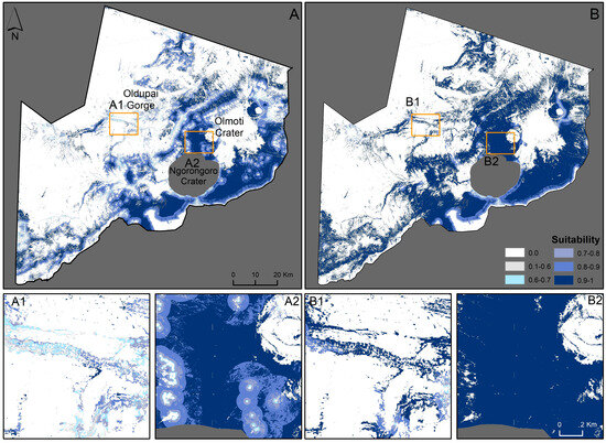 When comparing the models, the model with field data shows results that are contrary to the model without field data. The suitability maps of the fuzzy membership analysis show woody vegetation areas as dark green (>90% suitability, Figure 3A). Most of the NCA, including the Serengeti plains and the NC, is comprised of open grasslands with little or no vegetation and is classified as unsuitable (<27% suitability, Figure 3A). When human disturbances are reduced, the suitable area increases throughout (Figure 3B). The Oldupai Gorge and highlands between the NC and Olmoti Crater also become more suitable (Figure 3(A1,A2,B1,B2)), but overall remain less suitable when compared to Figure 2.
