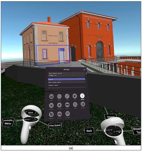 The results of the HBIM-VR combination made it possible to enhance the products of geomatics and their direct use both for technical and functional purposes, and for the enhancement of an important example of the area’s industrial heritage. The BIM-oriented platform was particularly effective for the technical audience, since it allowed us to inspect the elements in the model and visualise some information related to them as BIM categories, and family, object name, materials, etc. (Figure 9a). Moreover, it facilitated the possibility of adding annotations and images, hosting virtual meetings and taking measurements; functionalities that can have several advantages in the context of collaborative management and maintenance. Nevertheless, the graphic rendering of the model is simplified and optimised for VR by the platform, which employs non-controllable strategies during the model upload to the cloud space for visualisation. In addition, the use of a consumer-grade VR headset, which does not present a very high resolution (Figure 9a), did not allow for a high-quality graphical rendering of the virtual environment.