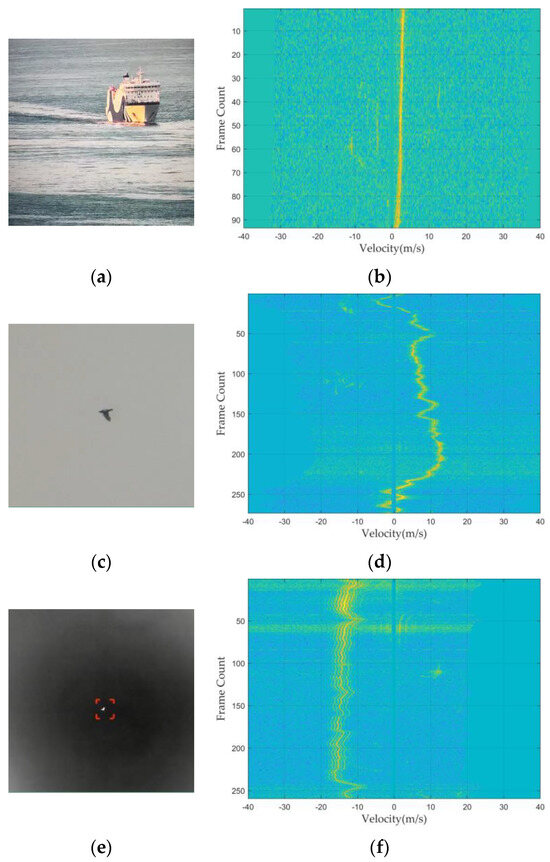 Doppler spectrogram of different target types: (a) optoelectronic image of ship; (b) Doppler spectrogram of ship; (c) optoelectronic image of bird; (d) Doppler spectrogram of bird; (e) optoelectronic image of flapping bird; (f) Doppler spectrogram of flapping bird; (g) optoelectronic image of bird flock; and (h) Doppler spectrogram of bird flock. For images (b,d,f,h), warmer colors (such as red and yellow) indicate higher Doppler spectrogram amplitude.