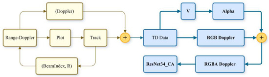 The main content of this article’s Section 2 primarily introduces the data structure of Ubiquitous Radar TD data and provides a detailed account of the main features and distinctions of four types of targets on the Doppler spectrogram. Section 3, starting from the TTI work mode of Ubiquitous Radar, describes in detail the method of generating a feature enhancement layer that can indicate the main spectrum region using track velocity information and incorporating it as an Alpha layer together with the original RGB three-channel Doppler spectrogram to form an RGBA four-channel Doppler spectrogram. Section 4 introduces the design of a classifier that employs ResNet34 as the backbone network with the addition of a CA module. Section 5 is the experimental section, mainly showing the enhancements to the classification results achieved with two types of improvements: embedding the CA module into the residual block and improving the Doppler spectrogram with RGBA four-channel enhancement.