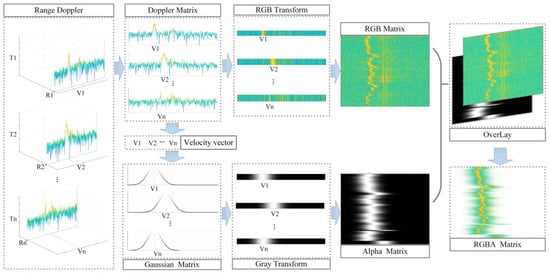 Based on this working mode, the Ubiquitous Radar provides track data for the identification module and also adds Doppler data. The Doppler data consist of one-dimensional data in the Doppler dimension obtained from range–Doppler (RD) data based on distance indexing within the tracking information. The one-dimensional Doppler data of all track points constitute two-dimensional Doppler data, which is then converted into RGB three-channel Doppler spectrograms using the RGB mapping matrix. The steps for generating an RGBA four-channel Doppler spectrogram using the feature enhancement layer are shown in the diagram below.