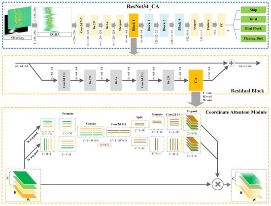 Firstly, the overall network architecture includes several key components. The input layer consists of a four-channel RGBA Doppler spectrogram. This is followed by convolutional and pooling layers where features are extracted through a series of convolution operations, including 7 × 7 convolutions, and pooling operations such as max pooling. Next, the architecture incorporates residual modules composed of multiple residual blocks, each integrated with a CA module to enhance feature representation [24]. Finally, the classification layer uses fully connected layers to classify the extracted features, producing outputs that include four categories: ship, bird, bird flock, and flapping bird.