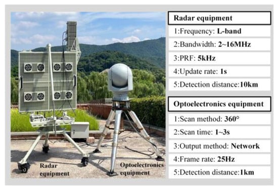 The field setup and main parameters of the Ubiquitous Radar are shown in Figure 6. This setup illustrates the installation positions and configurations of the radar and electro-optical equipment, ensuring optimal detection performance within the monitoring area. Specific parameters include the radar’s operating frequency, bandwidth, pulse repetition frequency, update rate, detection range, and the electro-optical equipment’s scanning method, scanning time, output method, frame rate, and detection range. These parameters provide the foundation for the system’s efficient operation.