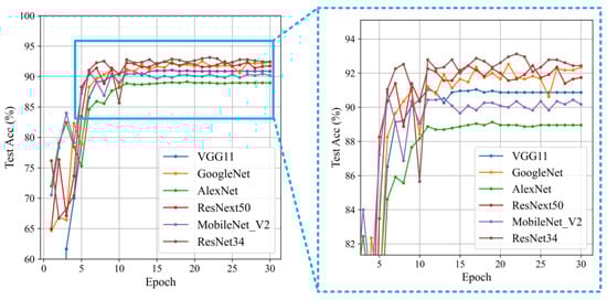 From Figure 8 and Table 2, it is evident that ResNet34 demonstrates significant performance advantages compared with other networks. After stabilization, ResNet34 achieved an accuracy of 93.13%, which is noticeably higher than the performance of other networks. This result indicates that ResNet34 not only adapts to data more quickly but also maintains high classification accuracy after extended training periods, showcasing its strong potential and reliability in practical applications.