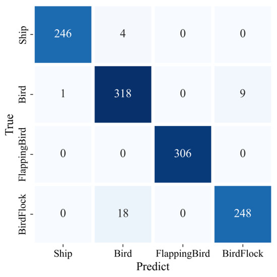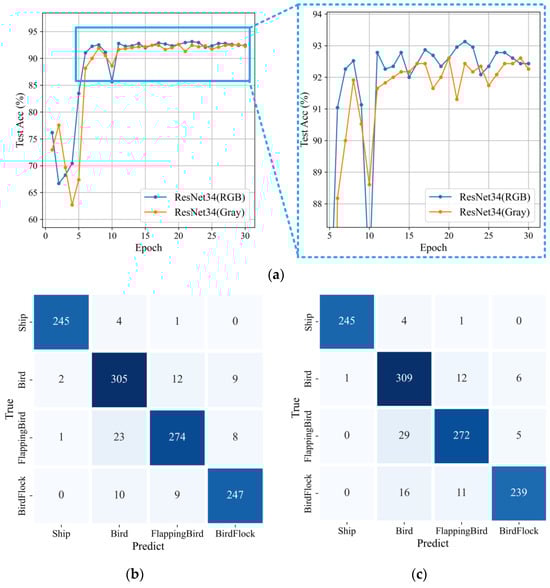 From Figure 9 and Table 3, it is evident that regarding accuracy comparison, the classification accuracy of RGB three-channel Doppler spectrograms increased from 92.61% to 93.13% compared with gray single-channel Doppler spectrograms. In the comparison of the confusion matrix, the confusion matrix of the gray single-channel Doppler spectrogram increased errors mainly in two aspects: birds and flapping birds and birds and bird flocks compared with the RGB three-channel Doppler spectrogram, indicating that the grayscale image has reduced the amount of information in the spectrograms to some extent, weakening the features of the main spectral width and micro-motion. Compared with this, RGB images can retain more information, especially color information. Therefore, for the fine classification work of similar targets that need to utilize the bandwidth of the main spectrum, especially the micro-motion features, RGB images as the data source for classification are undoubtedly the best choice.