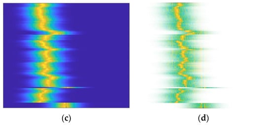 where is the row index of the and matrices, is the column index of the and matrices, and is the color channel index. The values of the three channels of the matrix are assigned to the first three channels (i.e., R, G, and B channels) of the matrix, and the values of the matrix are assigned to the fourth channel (i.e., Alpha channel) of the matrix. This completes the image preprocessing. This section first introduces the work mode of Ubiquitous Radar, which is TTI. This mode provides more target information for the identification module, adding Doppler data to the existing track data. Based on this work mode, we designed a spectrogram local enhancement method that uses tracking information to generate a transparent layer, which is combined with the original RGB three-channel Doppler spectrogram to form an RGBA four-channel spectrogram. This method of spectrogram local enhancement amplifies the main spectrum and its adjacent features while attenuating features outside of this area.