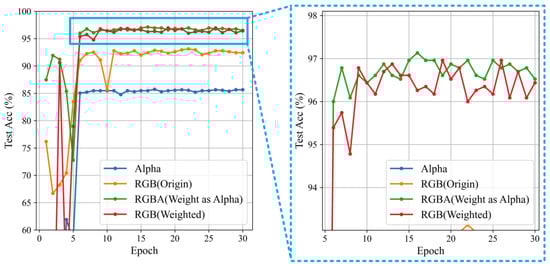 This section uses the ResNet34 backbone network to compare the classification effects of four types of data sources: the original RGB three-channel Doppler spectrograms, Alpha grayscale images, RGB three-channel Doppler spectrograms with a merged feature enhancement layer, and RGBA four-channel Doppler spectrograms with an overlaid feature enhancement layer. The RGB three-channel Doppler spectrograms with a merged feature enhancement layer are created by directly multiplying the feature enhancement layer with the original two-dimensional Doppler data and then transforming it using an RGB mapping matrix. The four types of input data are labeled in sequence as RGB (Origin), Alpha, RGB (Weighted), and RGBA (Weight as Alpha), with their data composition illustrated in Figure 10.