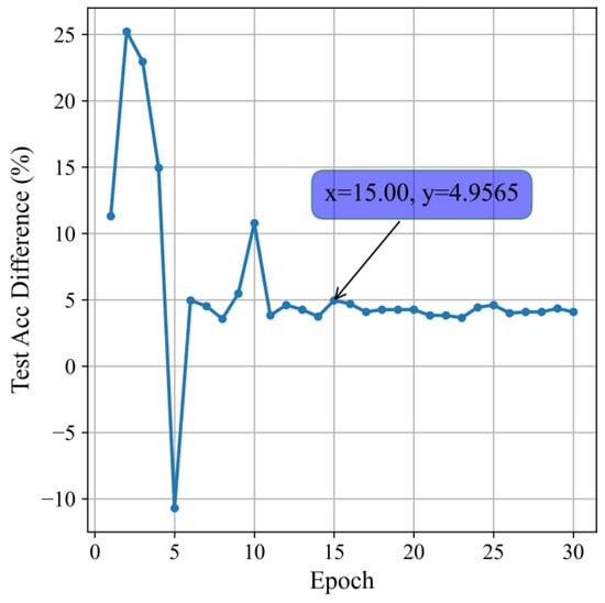 From Figure 12, it can be seen that the addition of the feature enhancement layer significantly improves the classification effect. After the model converges, the stable accuracy increases by up to nearly 5%. The optimal accuracy improvement is 4%.